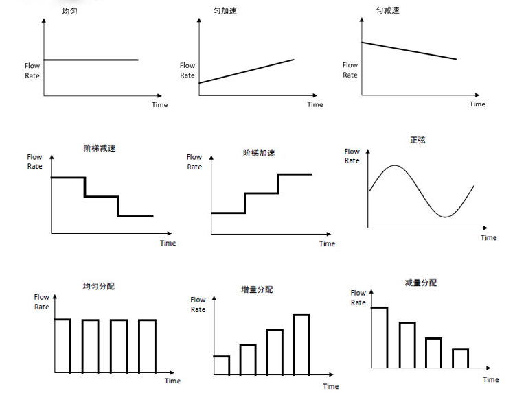 · 提供9種運行控制模塊:勻速、勻加速、勻減速、階梯加速、階梯減速、正弦、均勻分配、增量分配、減量分配