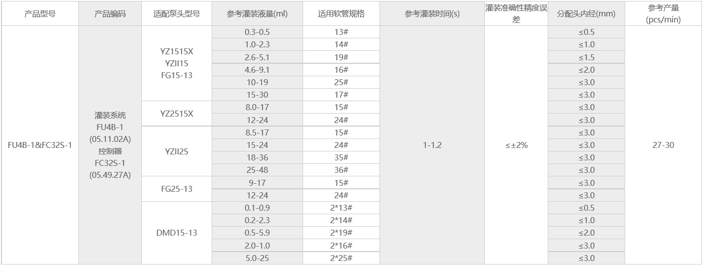 通道數(shù)量 | 4(單組灌裝系統(tǒng)FU4B-1)~32(8組灌裝系統(tǒng)FU4B-1) |