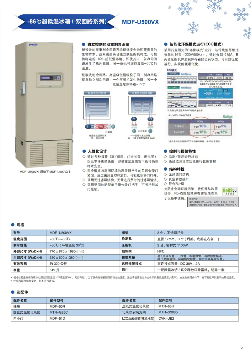新設計的雙重制冷回路系統確保安全地貯藏貴重的生物樣本。該系統由兩臺獨立的壓縮機構成,可提供穩定的-80℃超低溫環境。即使其中一條冷卻回路發生了意外故障,另一條也可維持最低-65℃的溫度。級聯式制冷回路:高溫級低溫級位于同一制冷回路雙重獨立制冷回路:一個壓縮機發生故障,另一個 能使溫度保持在-65℃