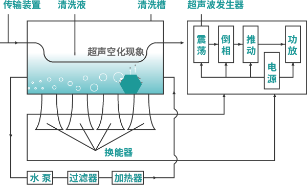 通過換能器,將功率超聲頻源的聲能轉(zhuǎn)換成機械振動,通過清洗槽壁將超聲波輻射到槽子中的清洗液。由于受到超聲波的輻射,槽內(nèi)液體中的微氣泡能夠在聲波的作用下快速變大破裂,破裂時產(chǎn)生的高強度剪切力作用于各類樣品上,從而達(dá)到清洗、提取、乳化、加速溶解、粉碎、分散等作用。