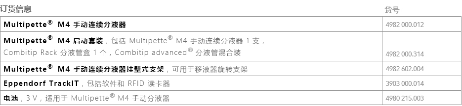 訂貨號:4982000314 Multipette? M4 手動連續分液器結合9種不同規格 Combitips advanced? 分液管,提供從 1 μL——10 mL 的分液范圍,一次吸液可完成最高 100 次分液。特別適合于高粘度、易起泡、易揮發、危險性等問題液體的移取及分裝。
