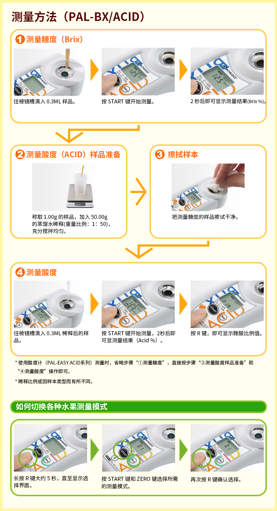 使用ATAGO(愛拓)糖酸度計(jì),糖度可直接取樣測(cè)量;酸度測(cè)量只需添加蒸餾水與測(cè)量樣品按重量比例(1:50)稀釋(即:果汁1ml,蒸餾水50ml)攪拌均勻后即可取樣測(cè)量。糖度及酸度測(cè)量完成后,按R鍵自動(dòng)顯示糖酸比。