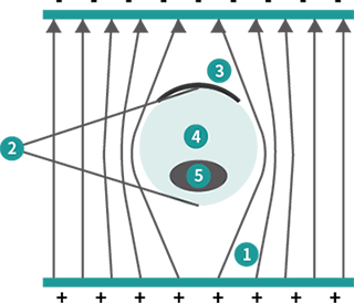 1 細胞膜近似絕緣體,細胞附近電轉液中電流扭曲。