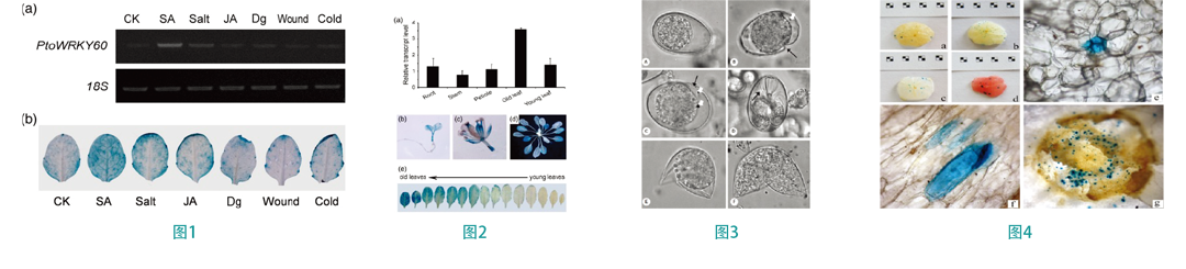 1、YE S, JIANG Y等人利用基因槍系統通過提高楊樹轉錄因子PtoWRKY60組成型表達提高楊樹對潰瘍病菌SACC的抗性研究結果。 【圖1、2】