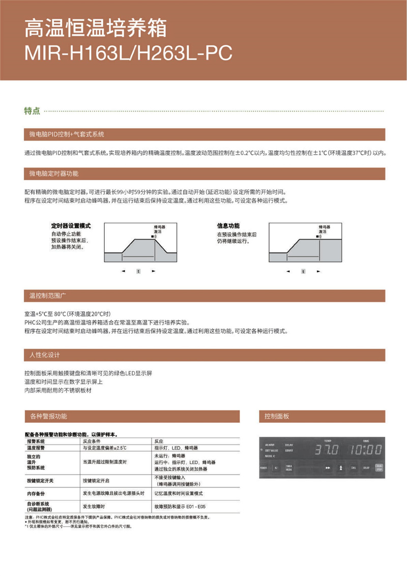 微電腦定時器功能;配有精確的微電腦定時器,可進行最長99小時59分鐘的實驗。通過自動開始(延遲功能)設定所需的開始時間。程序在設定時間結束時啟動蜂鳴器,并在運行結束后保持設定溫度通過利用這些功能,可設定各種運行模式定時器設置模式 蜂鳴器 信息功能 蜂鳴器 自動停止功能 激活 在預設操作結束后 激活 預設操作結束后 仍將繼續運行。 加熱器將關閉。